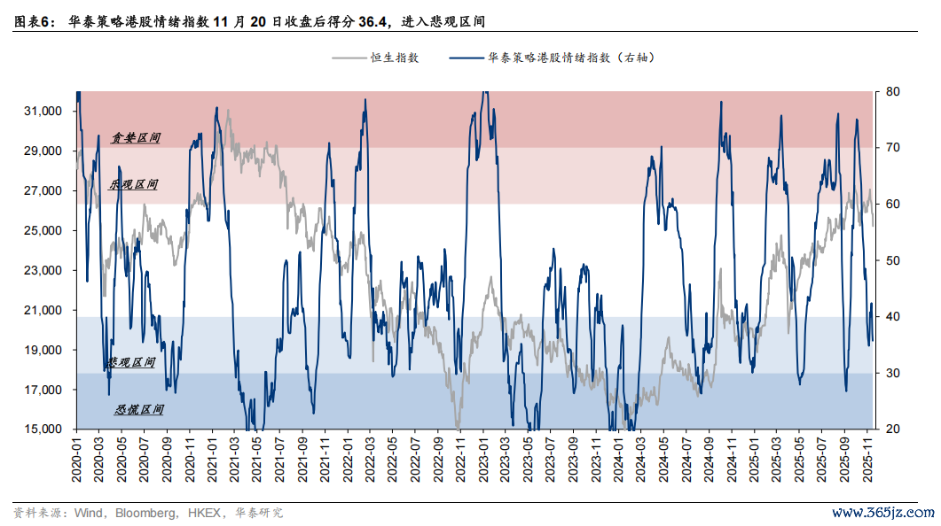 2) 截至昨日收盘,港股情绪指标为 36.4,仍在悲观区间。今日数据尚无法更新,但考虑到今日市场回调且南向流出,指标或继续下行。从该指标指示的操作信号看,指标进入悲观区间意味着上下行风险已经较为平衡,回落至 30 以下会正式触发买入信号。因此港股正在进入布局区,左侧投资者可以逐步建仓。对胜率要求更高或偏右侧的资金,可等待下周阿里、美团等港股核心企业发布财报以及密集解禁期结束。回溯来看,该指标上次触发信号为 10 月 2日,向上突破 70 进入贪婪区间,触发卖出信号,我们也成功提示投资者情绪过热,假期结束后波动率可能上升。