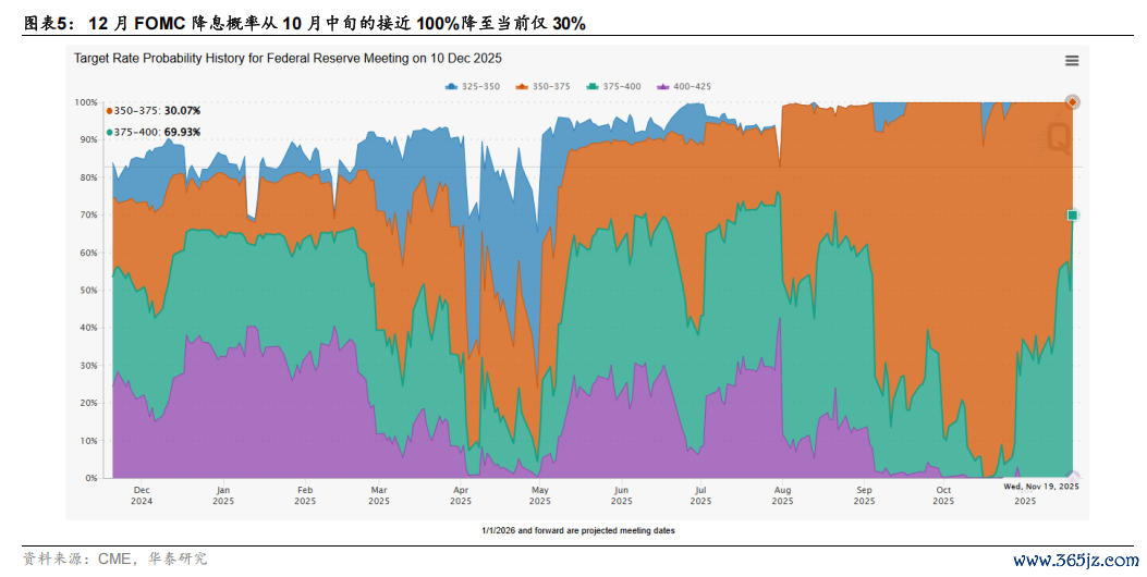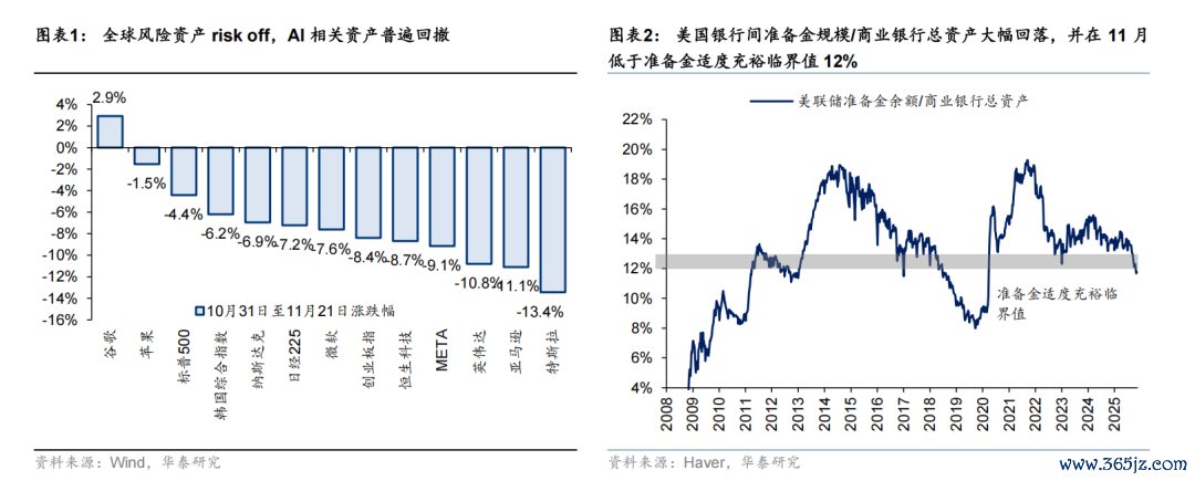 流动性环境近期边际收紧。1)年底成交活跃度下降。A 股近期日成交额回落至 2 万亿元以下,较 Q3 中枢显著回落,换手率也从 Q3 约 5%中枢回落至当前约 4%,单周港股换手率回落至 9%(近一个季度平均 10.8%),美股成交额同样出现萎缩。2)南向资金流入动能趋缓。10 月以来南向资金日均净流入从 9 月的 84.1 亿降至 57.5 亿港币附近。国内机构港股仓位普遍较高(3Q 国内主动偏股公募基金港股仓位在 28.2%的历史高位附近)、浮盈较多是主要原因,也有季节性因素。历史上看 12 月南向平均净流入相较于 9 月缩窄约 25%。3)美元流动性压制海外资产表现,也产生传导效果。从量上看,美国银行间准备金规模/商业银行总资产大幅回落,并在 11 月低于准备金适度充裕临界值 12%。从价上看,12 月 FOMC 降息概率从 10 月中旬的接近 100%降至当前仅 30%。4)供给压力增加。年底港股解禁金额提升较快,12 月港股潜在解禁金额约 1200 亿港币,对比来看,9、10、11 月解禁金额约 121 亿、624 亿、701 亿。