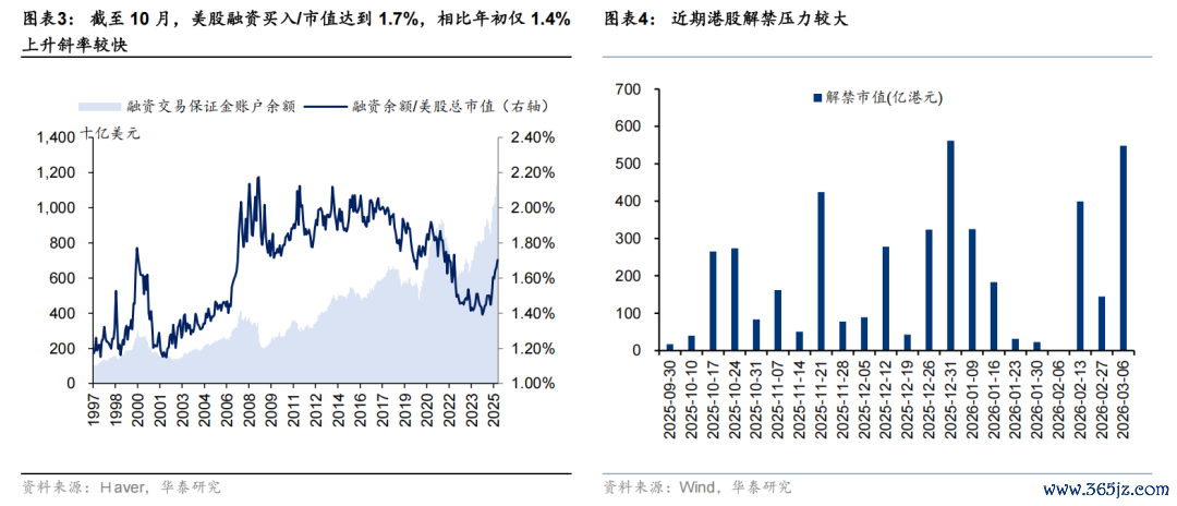 叠加前期市场杠杆仓位普遍较高,上述扰动也可能触发技术性回调。1)截至 11 月 20 日,A 股融资余额达 2.43 万亿元,仍处于年内较高水平。2)港股 11 月最新看沽、看购期权持仓较 10 月同期均提升约 15%。3)截至 10 月,美股融资余额/市值达到 1.7%,相比年初 1.4%上升较快。