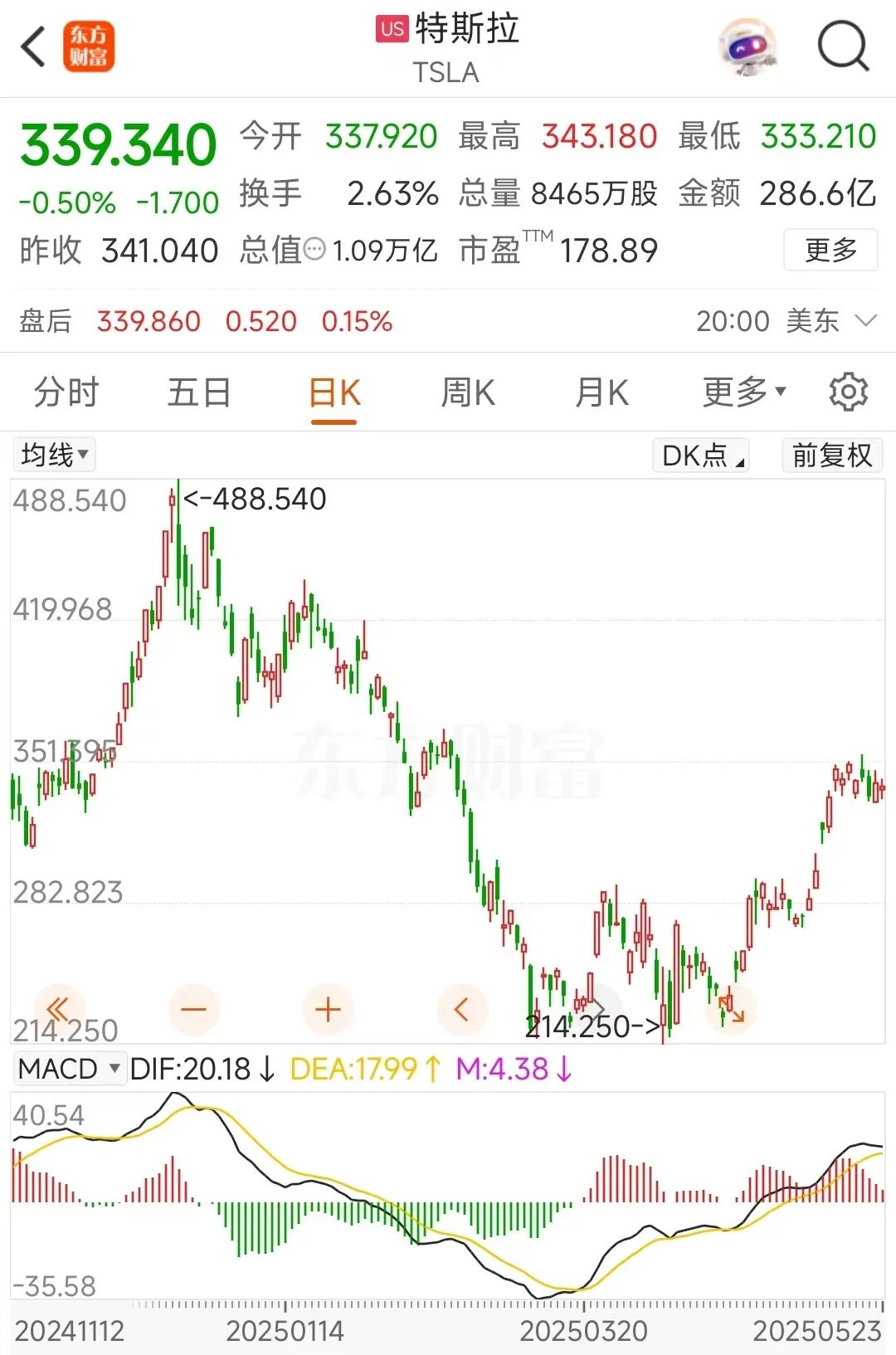 从股价来看,特斯拉最近一度出现股价腰斩的情形,从488美元上方一路跌至214美元附近。即使按最新收盘价339.34美元计算,和前高488.54美元相比,仍下跌超过30%。