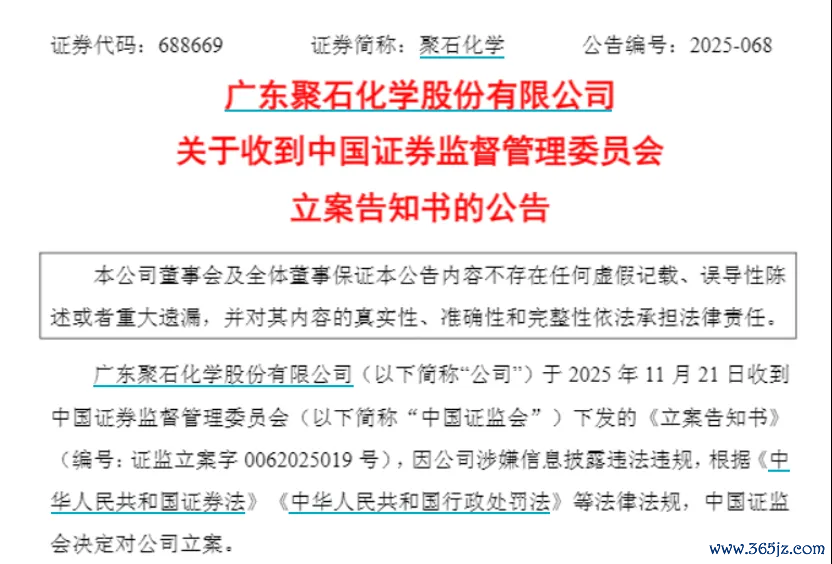11月21日晚间,聚石化学(688669)公告称,公司于当日收到证监会下发的《立案告知书》,因公司涉嫌信息披露违法违规,证监会决定对公司立案。