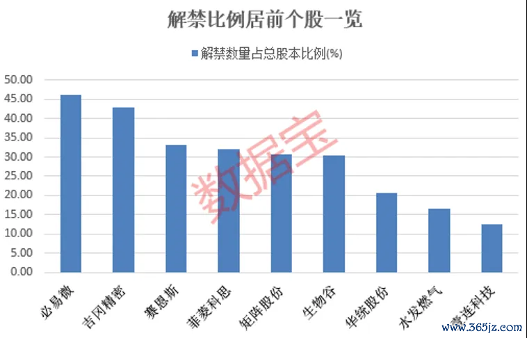 从解禁比例来看,必易微、吉冈精密、赛恩斯、菲菱科思等6股的解禁比例居前,均超30%。