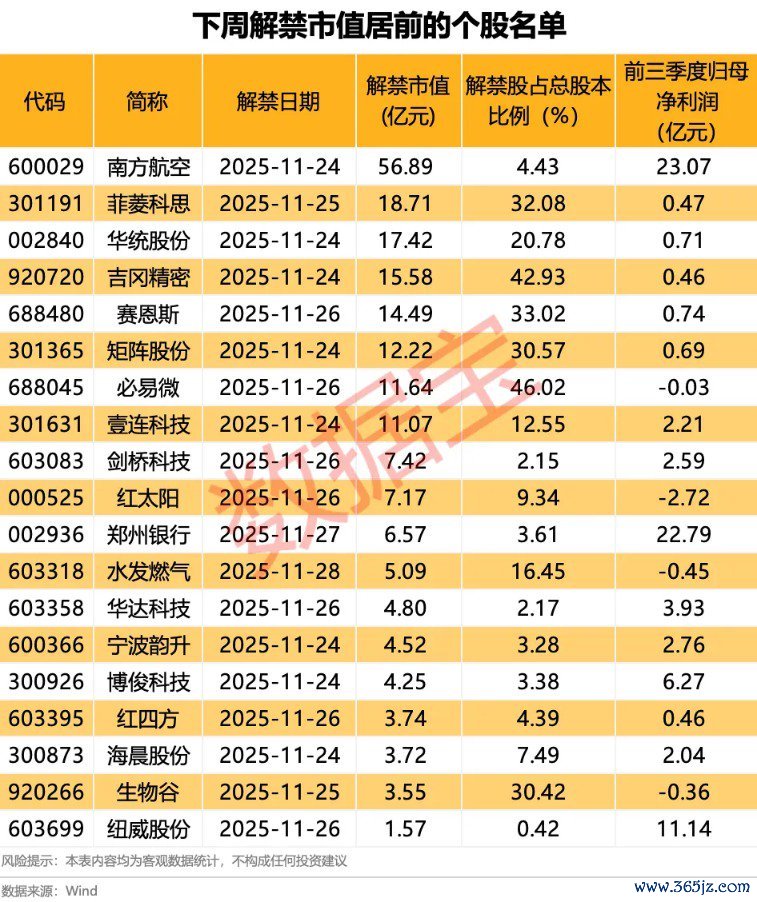 南方航空下周将有8.04亿股上市流通,主要为定向增发机构配售股份,解禁市值达56.89亿元。